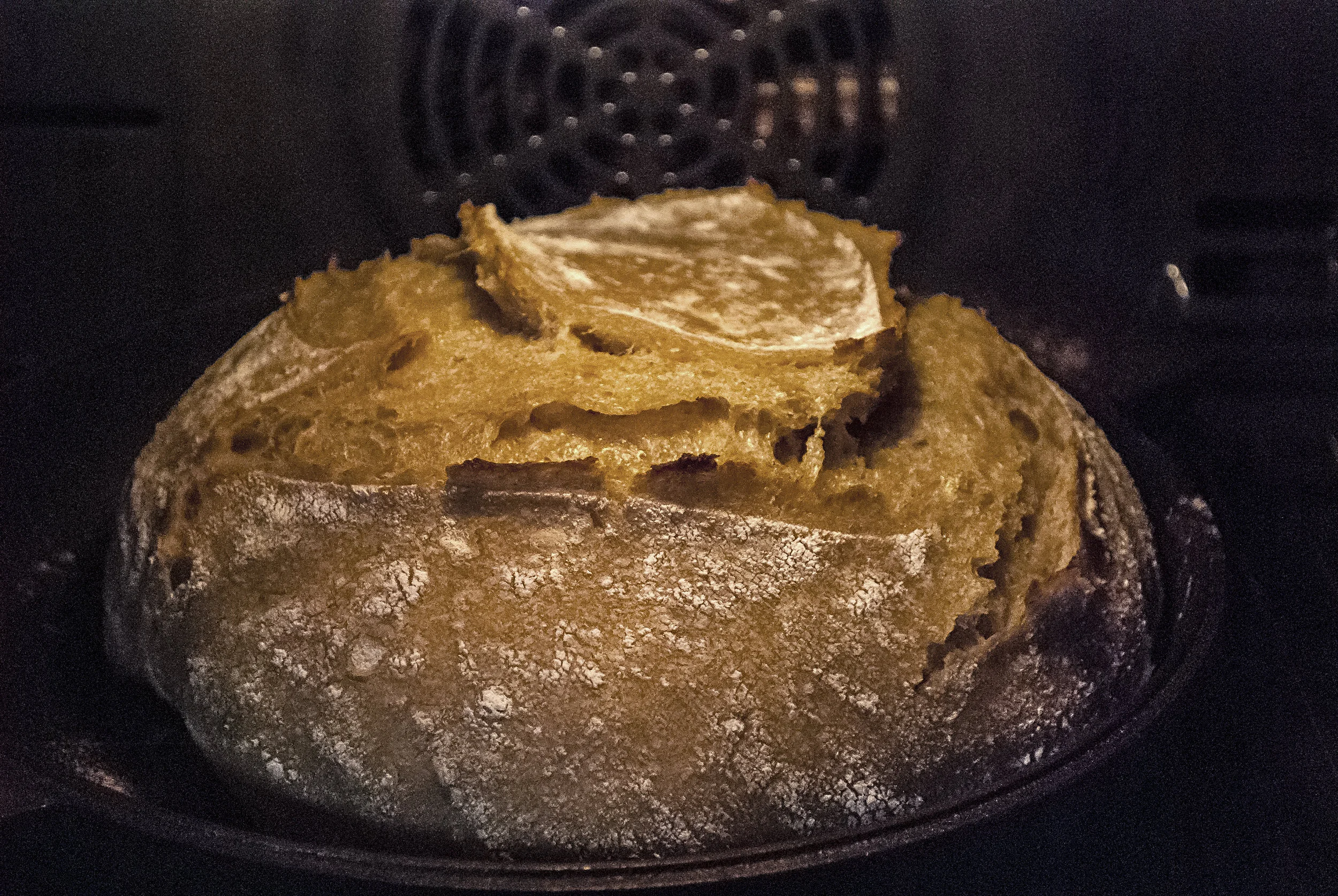 Varm en støbejernsgryde med låg op til 245° C, Det tager ca. 50 minutter, så være på forkant. Vend forsigtigt brødet over i gryden, støt det bedst muligt på undersiden, men pas på fingrene. Skær en firkant med en skarp kniv, gerne barberblad, sæt låg på gryden og sæt den tilbage i ovnen. Bag brødet 20 minutter med låg og derefter 20 minutter uden låg. Jeg bager aldrig med varmluft, og vil frafråde det efter låget er taget af gryden.